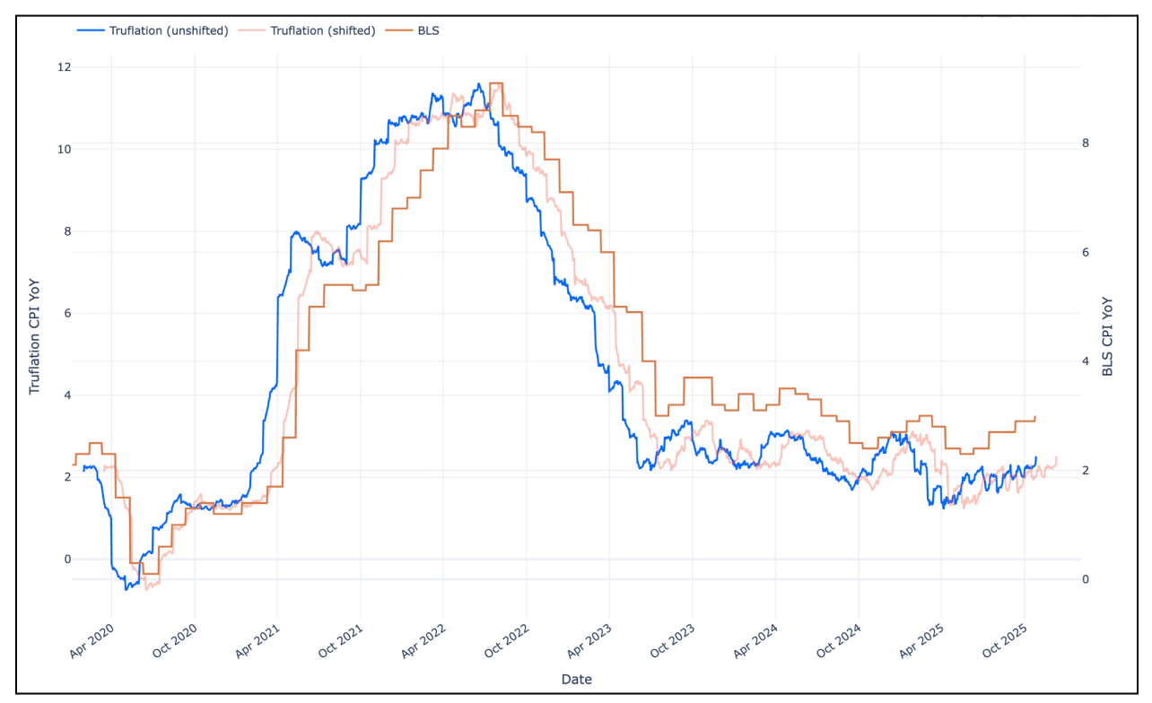 - Truflation has accurately anticipated CPI releases, often predicting the official figure within ~0.1%.
