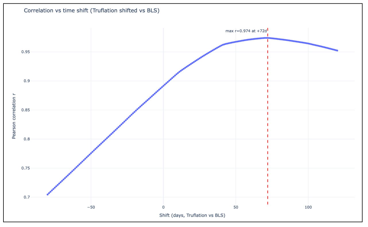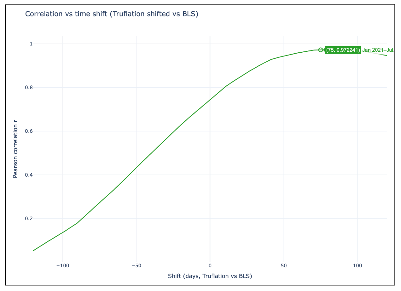 The highest correlation for the full sample occurs when Truflation is shifted ahead of CPI by approximately 72 days, with a peak Pearson correlation coefficient of r = 0.974.