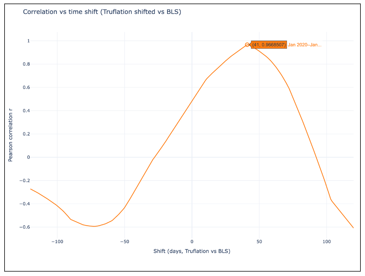 In this second graph, the correlation between Truflation and the BLS CPI is computed across all day-shifts from –80 to +120 days.