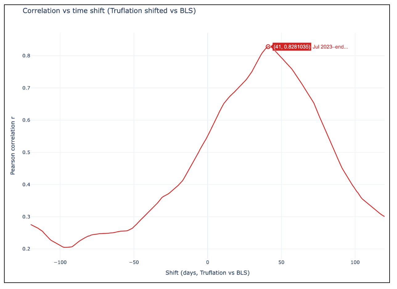 When shifted by ~45 days, Truflation’s daily YoY trajectory visually aligns with the BLS CPI curve. Peaks, troughs, and turning points are nearly synchronous. This confirms our commonly cited “~45-day lead” from a visual pattern recognition standpoint.